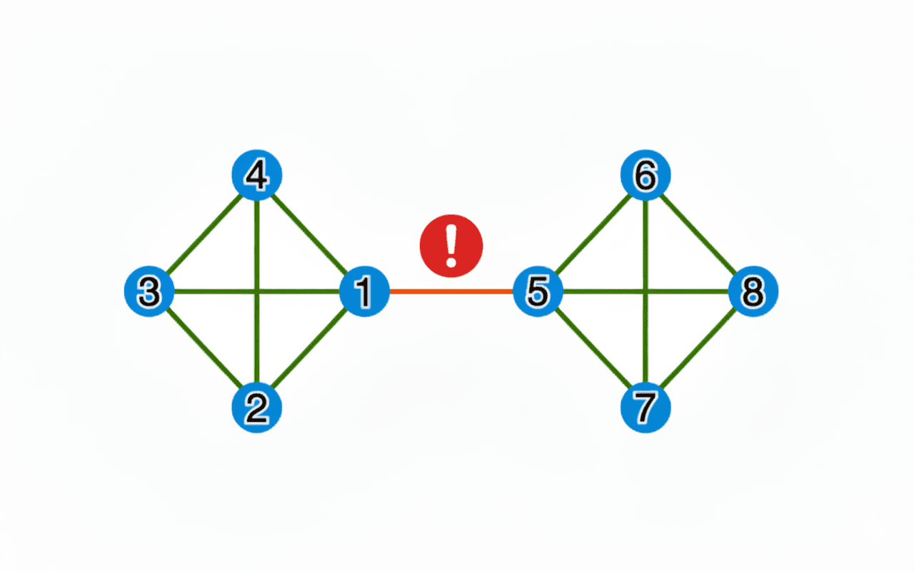 The problem is that a single pairwise misclassification - in the diagram above the link between node 1 and 5 - causes a large number of implicit false positives: all the pairwise links between the two clusters (1,2,3,4) and (5,6,7,8) are now effectively false positives.