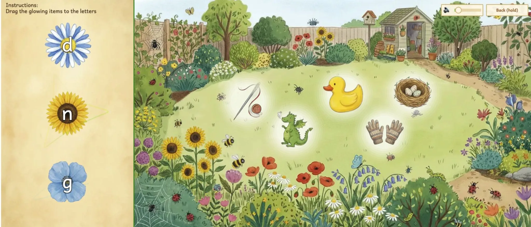 A simple letter learning game for preschoolers. The user drags images onto the flowers.