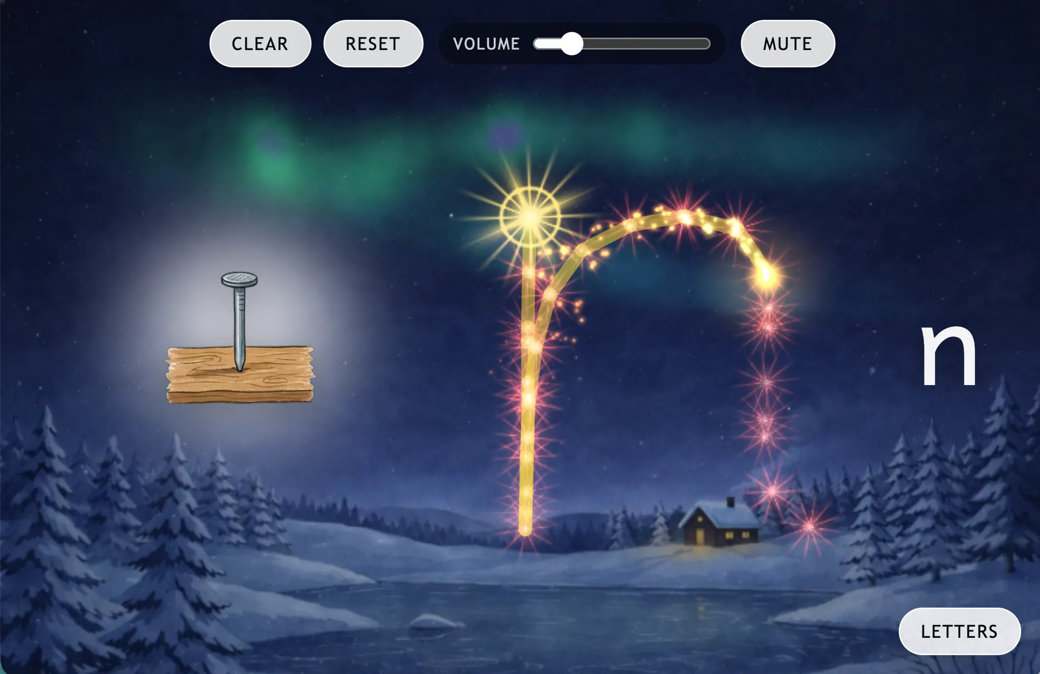 A letter formation game for preschoolers. The user must complete the ‘dot to dot’ of star constellations to form the shape of a letter.